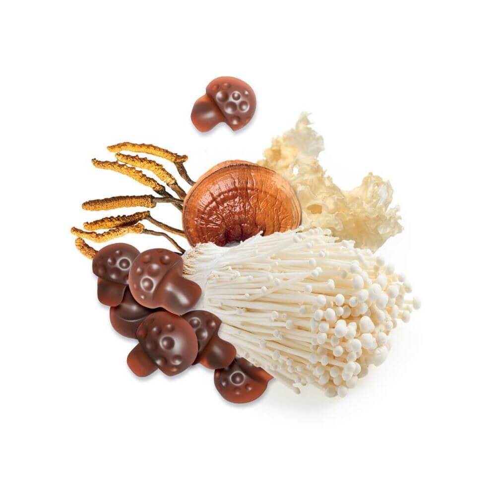 Chaga (Inonotus obliquus), fruiting body extract – 25 mg, Hericium (Hericium erinaceus), fruiting body extract – 25 mg, Cordyceps (Cordyceps sinensis), mycelium extract – 25 mg, Reishi (Ganoderma lucidum), fruiting body extract – 25 mg, Enoki (Flammulina velutipes), fruiting body extract – 25 mg, Maitake (Grifola frondosa), fruiting body extract – 25 mg, Shiitake (Lentinula edodes), fruiting body extract – 25 mg, Agaricus (Agaricus blazei Murill), fruiting body extract – 25 mg, Tremella (Tremella fuciformis), fruiting body extract – 25 mg, Oyster (Pleurotus ostreatus), fruiting body extract – 25 mg, Pectin, vegetable oil, maltitol, citric acid, concentrated juice blend, erythritol